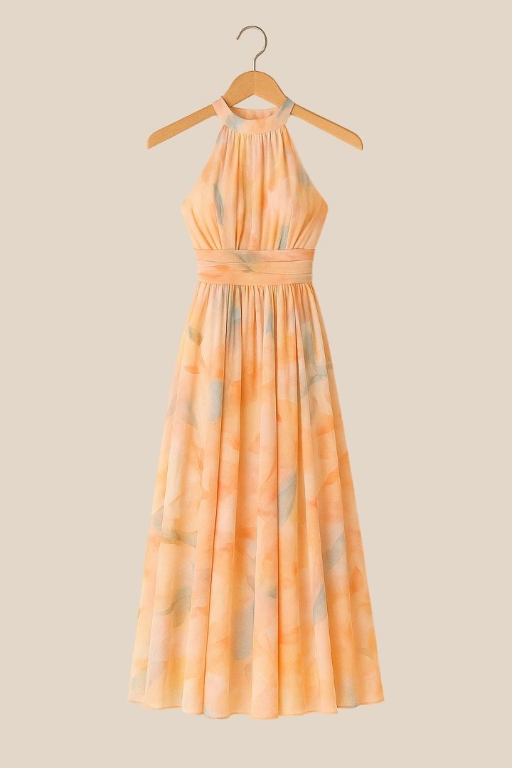 Peach Blossom-kjolen utstråler ren sommerromantikk. Med sitt myke akvarellmønster i varme ferskenfarger og den elegante halsklips-snittet er den den perfekte følgesvenn for solfylte dager og lune kvelder.