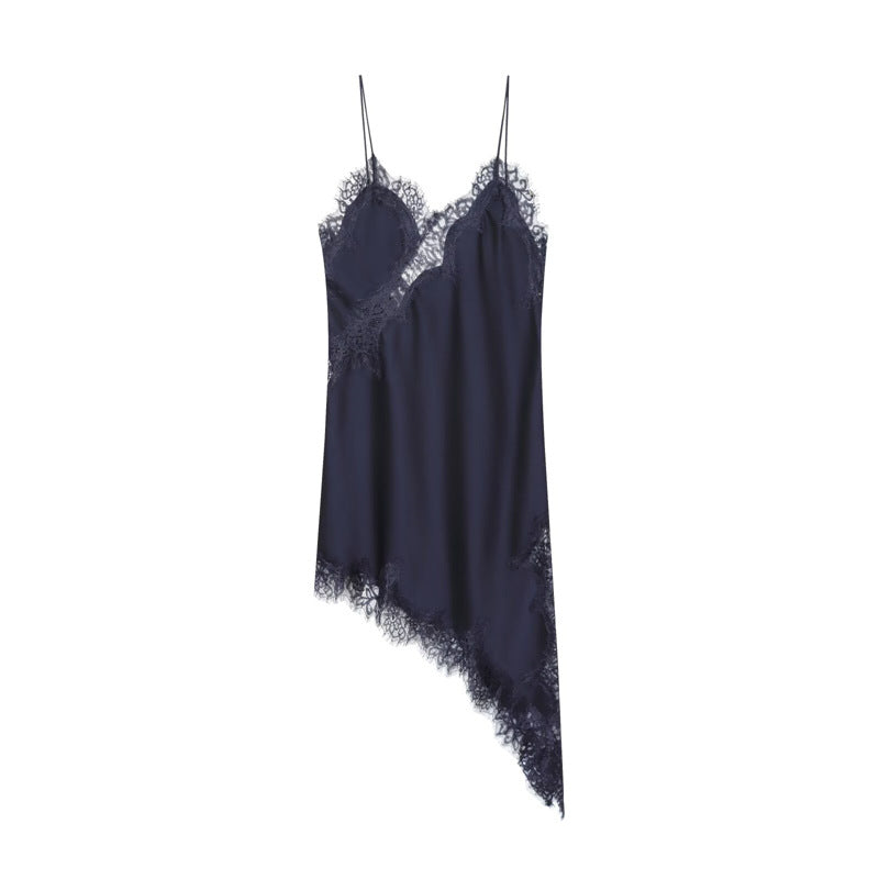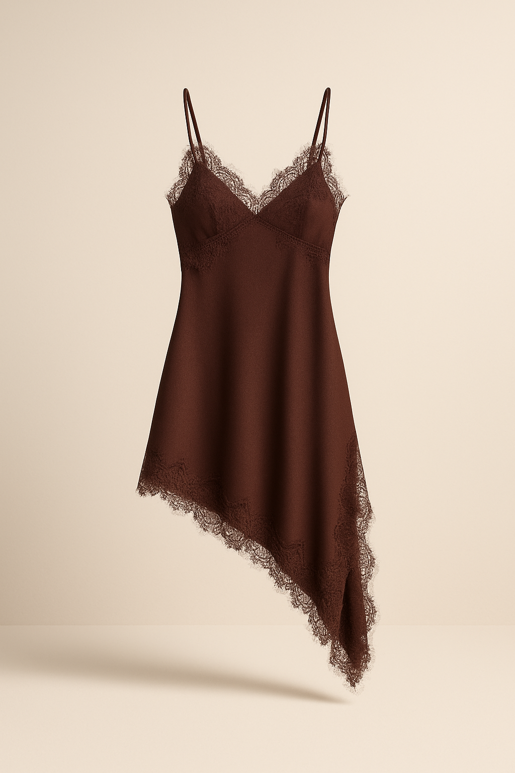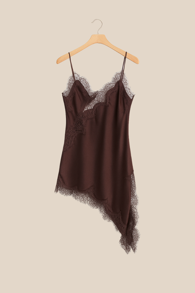 Opplev tidløs eleganse med denne luksuriøse pyjamasen i glatt acetat-sateng. Den feminine V-halsen med fine blondedetaljer og asymmetrisk kant gir en sensuell, men sofistikert look – perfekt både til avslappede kvelder hjemme og spesielle øyeblikk.